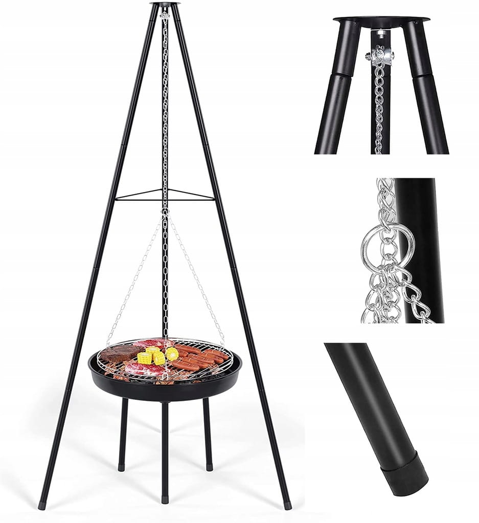 DUŻY GRILL OGRODOWY, WĘGLOWY, NA TRÓJNOGU Z PALENISKIEM I WISZĄCYM RUSZTEM